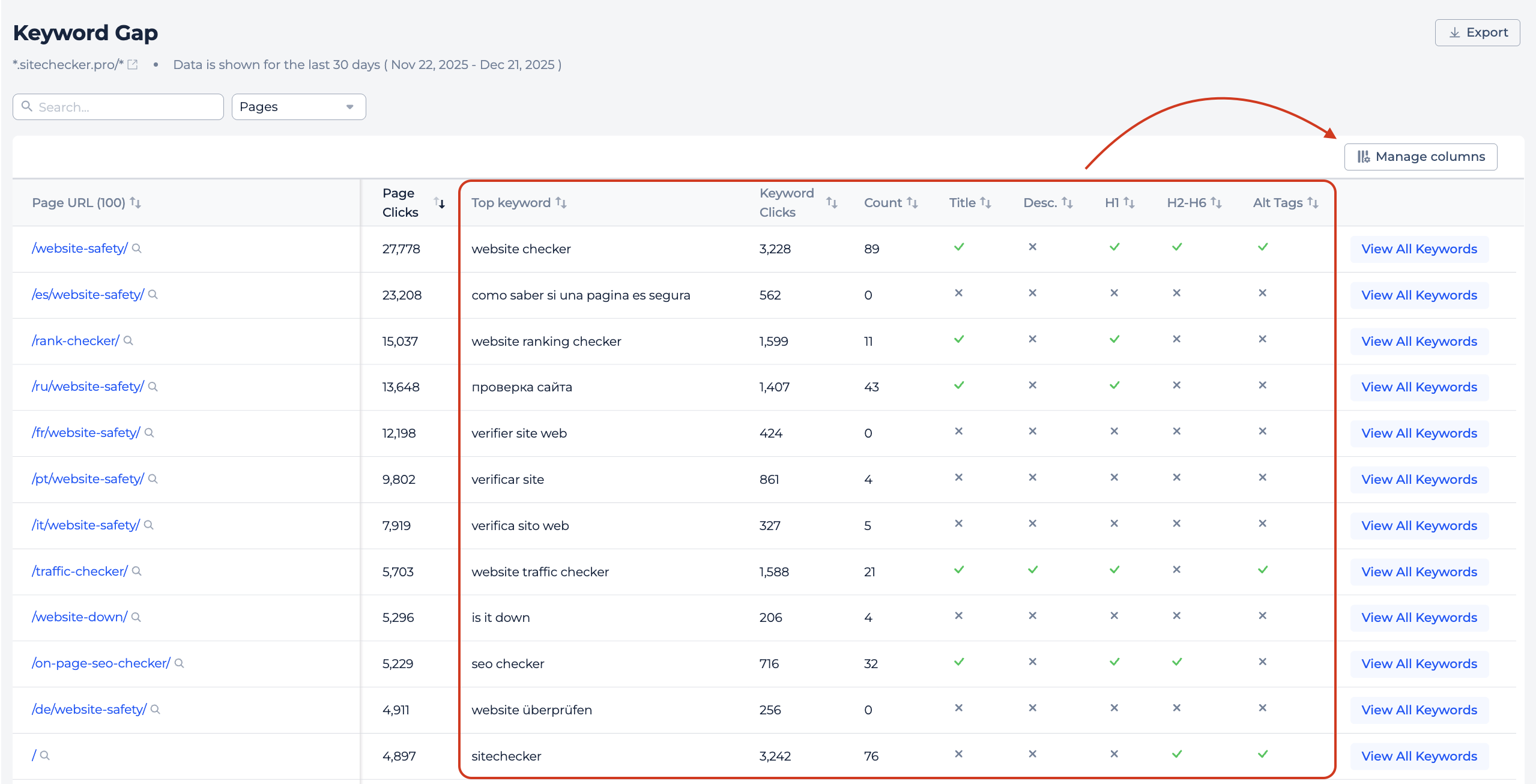 By default, the report shows only the most important data so you can quickly understand whether optimization is strong or needs improvement. If you need more context, you can enable additional page or keyword metrics using Manage Columns.