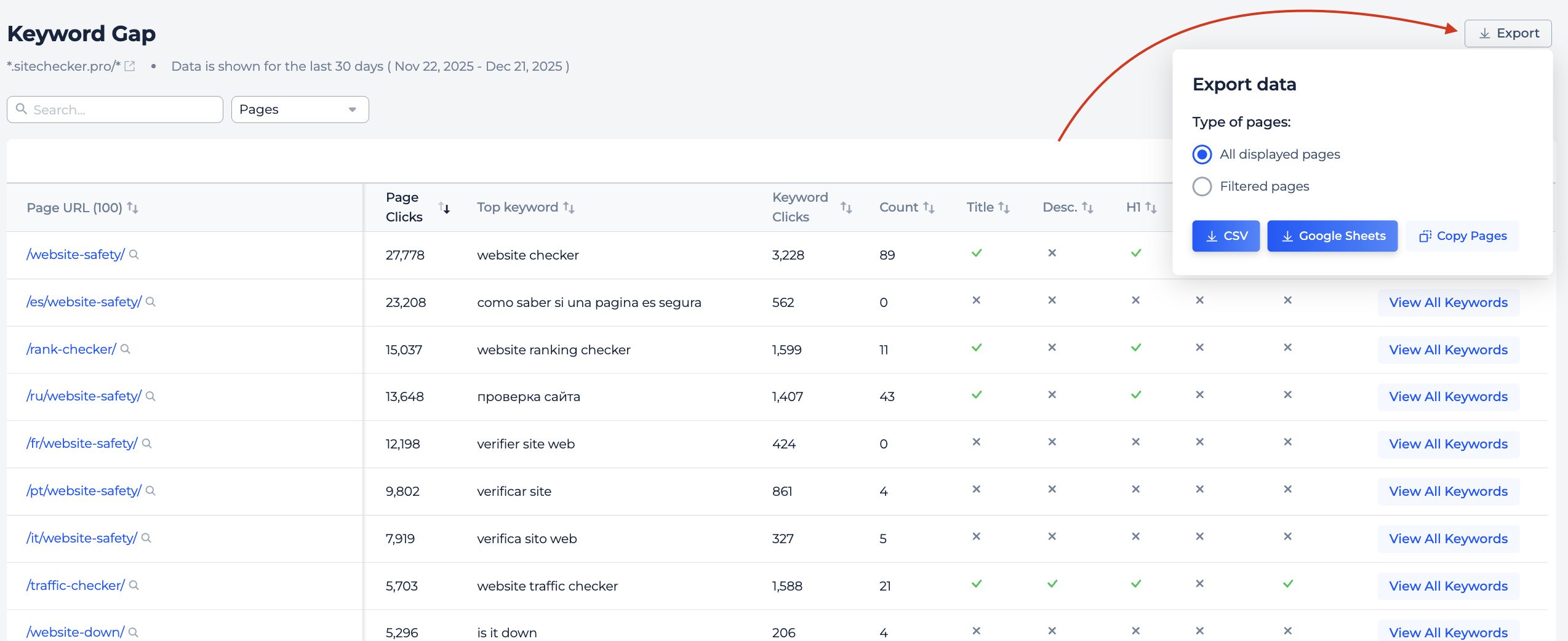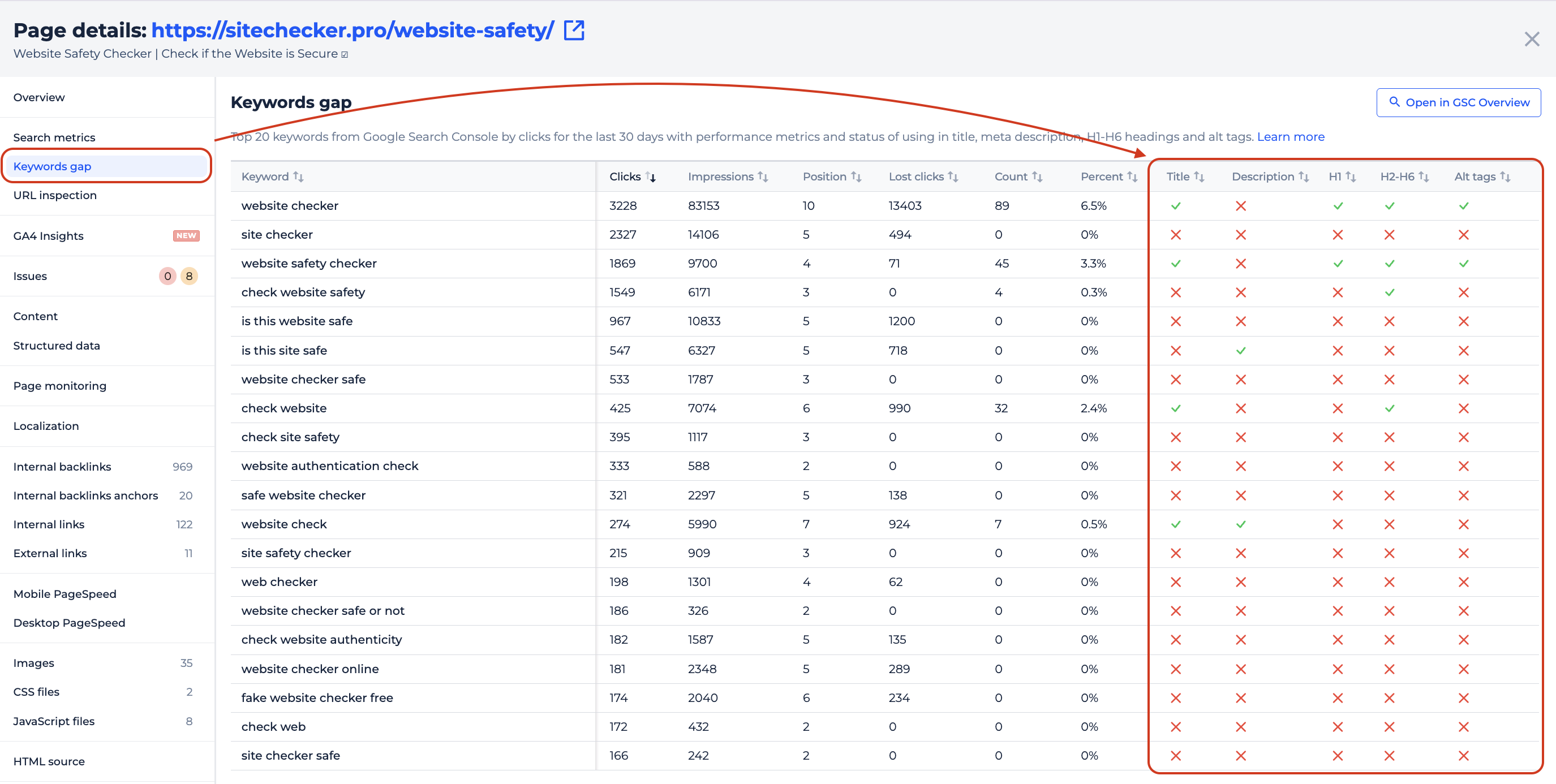 This report is useful when you want to make sure your highest-traffic pages are properly optimized for the keywords that already perform well. It helps identify pages that rank and get clicks but are not fully optimized in key SEO elements.