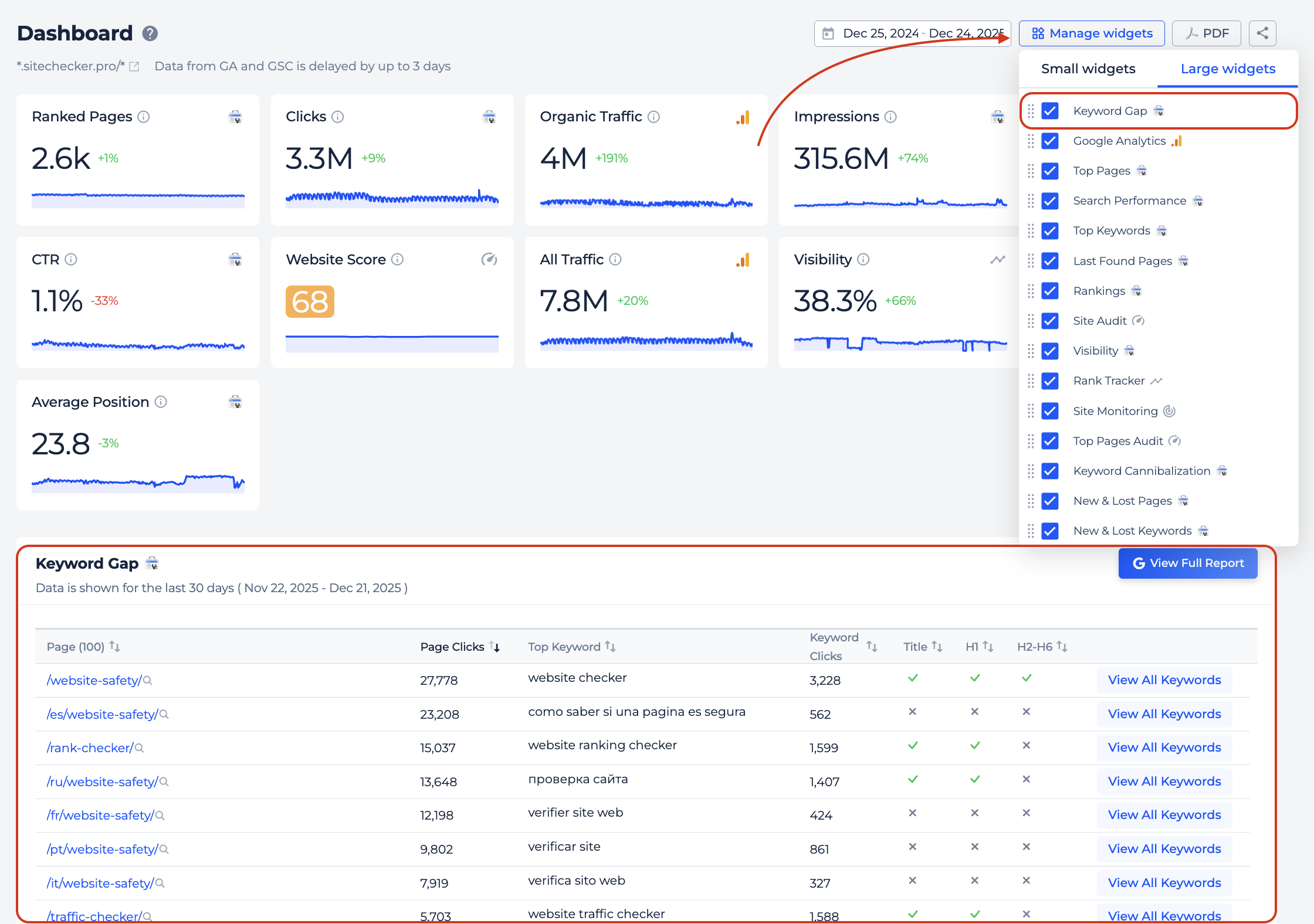 Clicking View All Keywords opens Page Details with the Keyword Gap section for the selected page. The widget also includes a View Full Report button that opens the full Keyword Gap report.