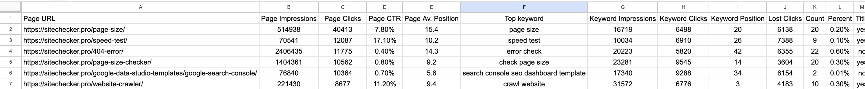 It generates a table that mirrors the data shown in the report, including pages, their top keywords, search metrics, and keyword usage across key SEO elements.