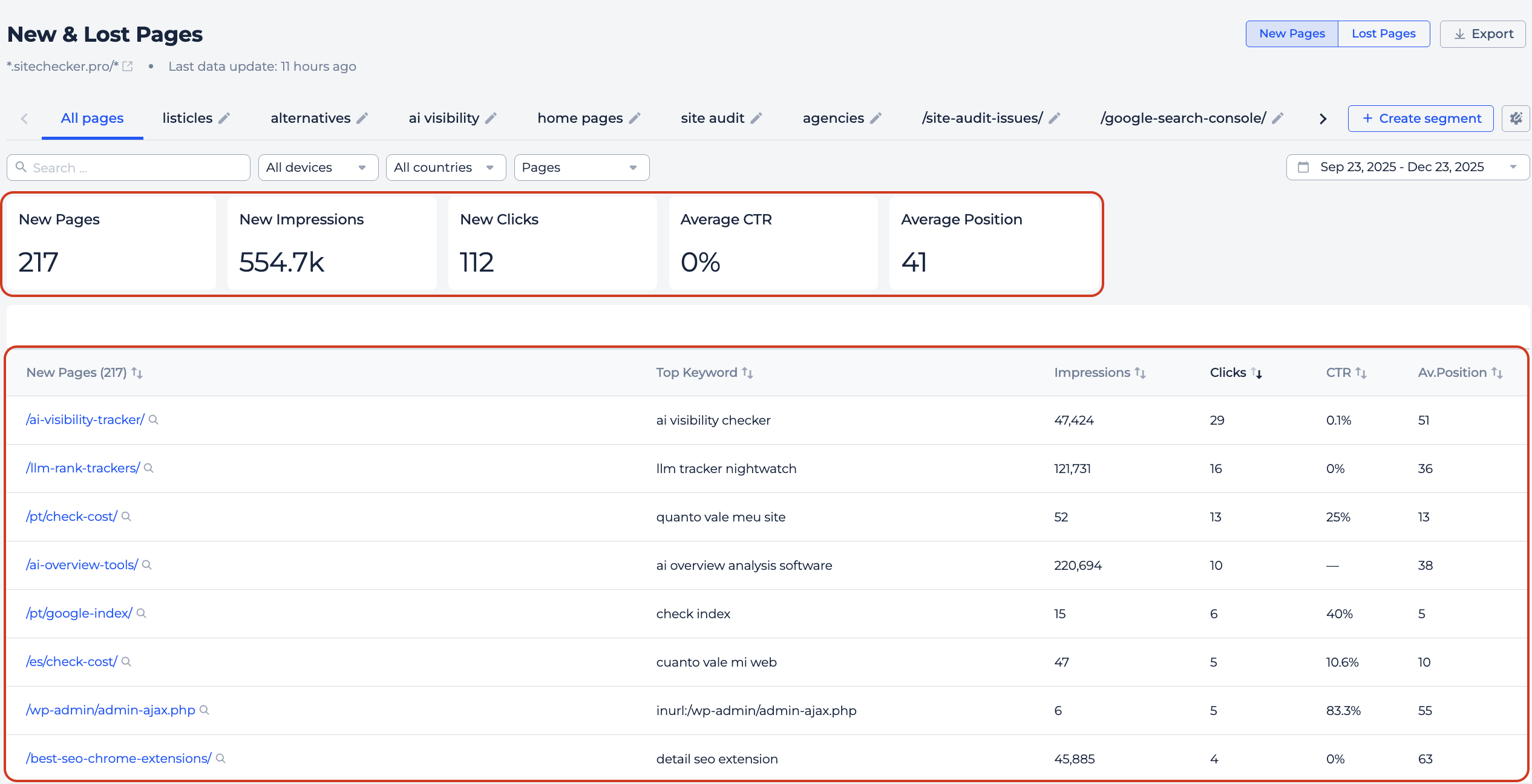 For each page, you can see its search metrics and the main query it ranks for. Pages are sorted by clicks so you can quickly identify which new pages bring the most traffic.
