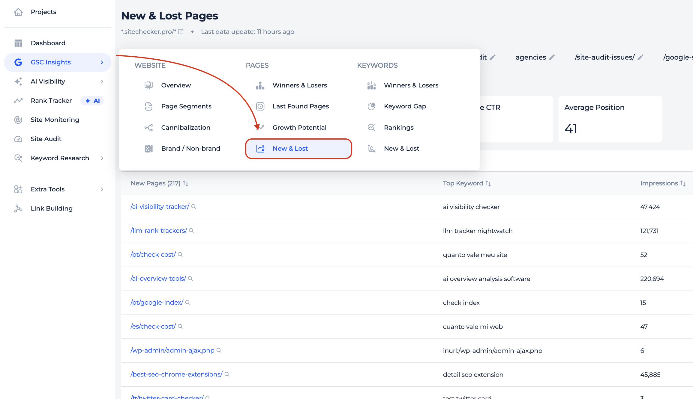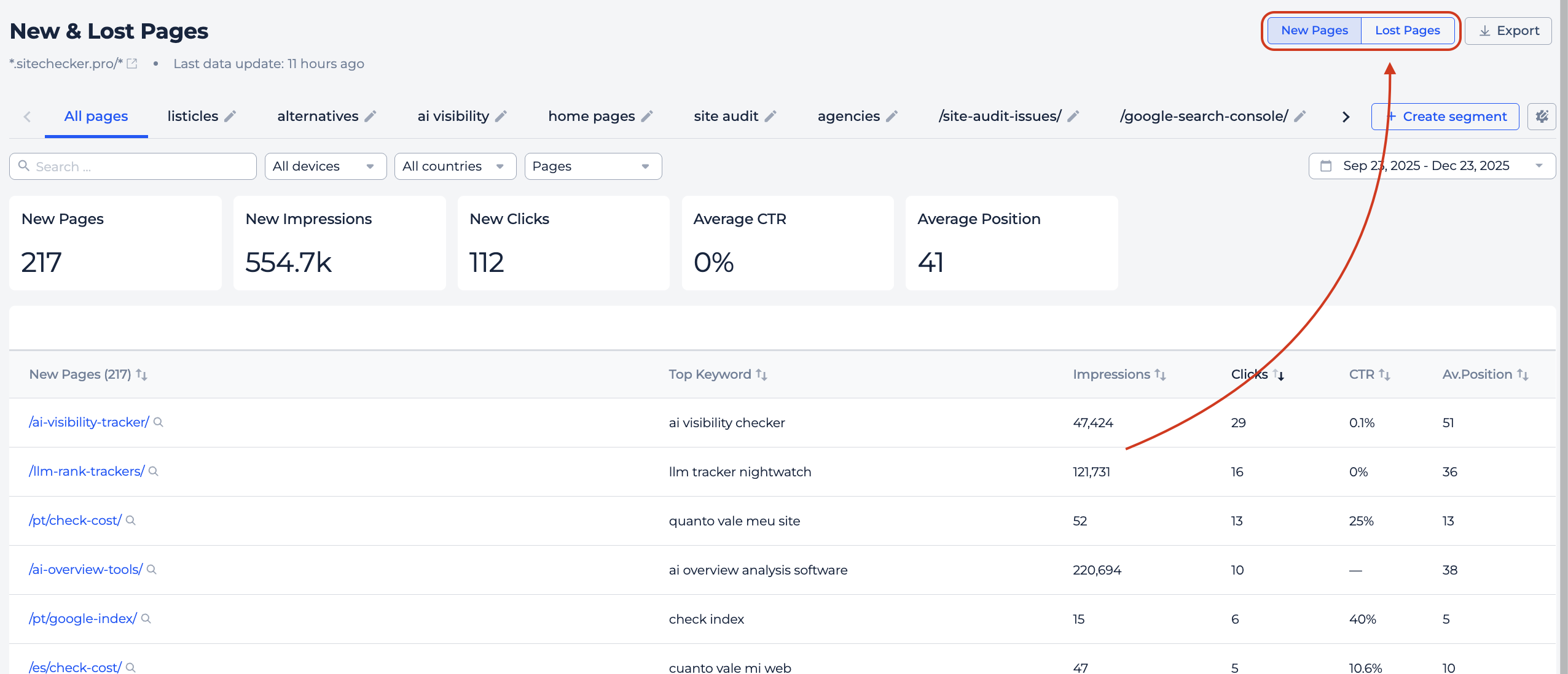 The New & Lost Pages report helps you understand how your set of ranking pages changes over time. It shows which pages started ranking in the current period and which pages stopped ranking compared to the previous period.