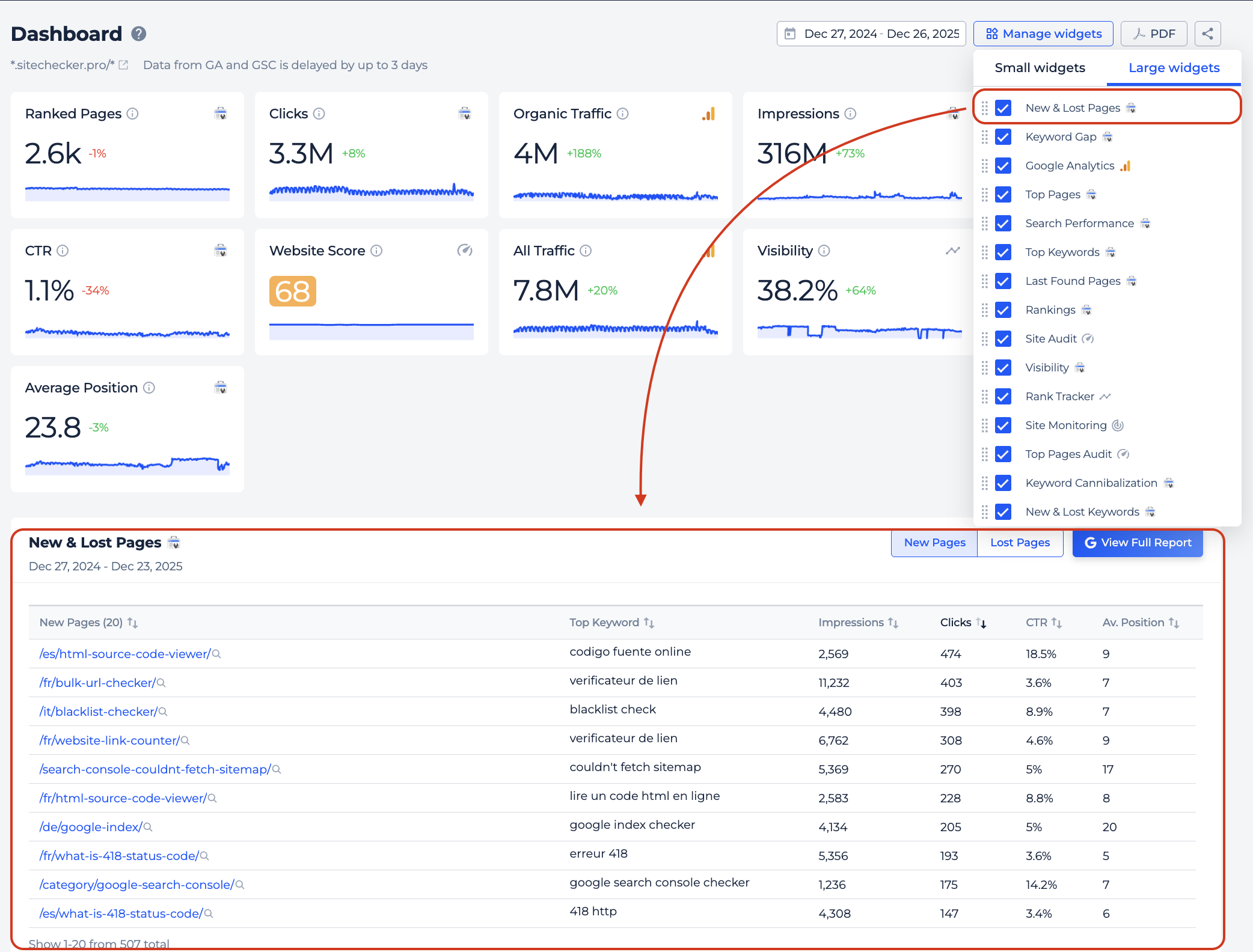The New & Lost Pages widget is also available on the Dashboard and shows a compact overview of page changes. You can switch between New and Lost pages directly on the widget.